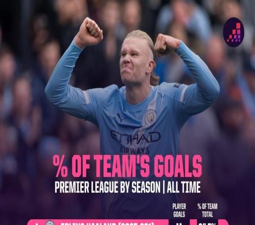 哈兰德本赛季进球数占曼城全队64.7%,若维持住将破英超纪录