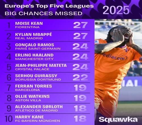 北京时间1月1日,知名数据机构Squawka统计出了2025年欧洲五大联赛错失绝佳机会次数最多的10名球员,莫伊塞-基恩...