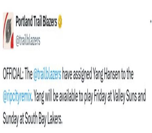 开拓者官宣下放杨瀚森:本周六迎发展联盟首秀连续出战太阳湖人