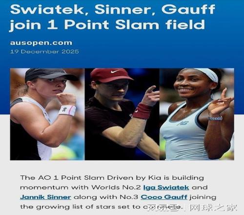 北京时间今晨,澳大利亚网球协会官宣,将于明年在澳网开幕前举办的“一分制胜大满贯”有新球员加盟,他们是波兰名将斯瓦泰克、世界第二辛纳、美国一姐高芙。此前,澳洲网协已经官宣世界第一阿尔卡拉斯和本土名将克耶高斯出战这项特殊赛事。这样一来,已经有五名职业球员确认参赛。