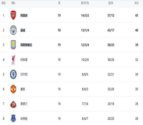 在积分榜上,阿森纳总积分达到45分,排名第1。曼城以40分排名第2,落后了5分。不过,曼城少赛一场。阿斯顿维拉依然是39分,排名第3,争冠形势恶化了。利物浦以32分排名第4。第5的是切尔西,拿到30分。曼联也是30分,排名第6。桑德兰和埃弗顿都是28分。纽卡斯尔联只拿到26分,排名第10。热刺只有25分,排名第13。