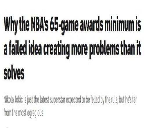 然而,NBA却偏偏出台了这样一条规则。2023年,NBA正式设立了65场出勤门槛,球员必须满足这一条件才有资格角逐主要的赛季末奖项。即便没有这条规则,约基奇的伤势几乎也注定让他无缘MVP之争,但他的缺阵场次恰好可能超过资格线,这一情况让这条本就毫无实际意义的规则引发了广泛关注。历史早已告诉我们,长期缺阵的球员很少能赢得奖项。
