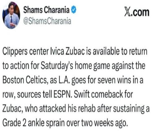 爆料王Shams:祖巴茨将在本周日快船主场VS凯尔特人比赛中复出。