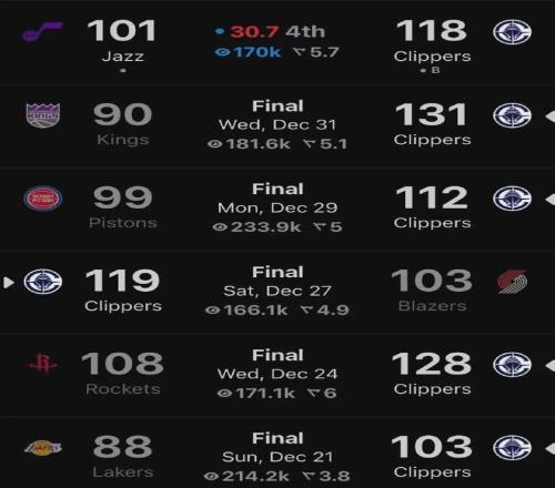 值得一提的是,在祖巴茨受伤的那场比赛以及休战的五场比赛里,快船全部赢球从而豪取六连胜,因此战绩从垫底位置飙升至如今的12胜21负位列西部第11,暂时落后第十的开拓者两个胜场。