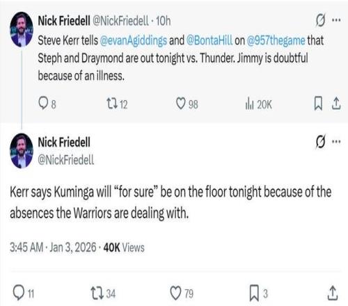 值得一的是,在勇士官方临时宣布这一消息前不久,主帅科尔才在公开的采访中表示受到球队多人因伤缺席的影响,本场比赛库明加一定会出战。