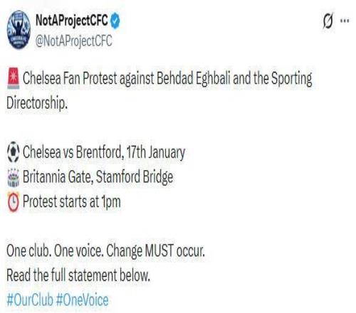 北京时间1月3日凌晨,切尔西球迷组织“Not a Project CFC”在社交媒体上发表动态,号召球迷在对阵布伦特福德的比赛中抗议俱乐部。