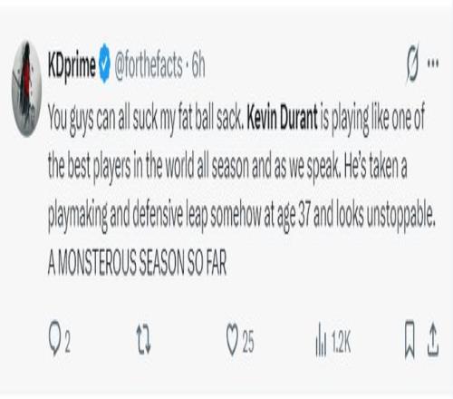 杜兰特球迷组织:杜兰特整个赛季的表现堪称世界最顶级,这场比赛也如此。他以 37 岁的高龄在传球能力和防守能力上都有提升,本赛季看起来势不可挡。迄今为止,他打出了一个极其出色的赛季。