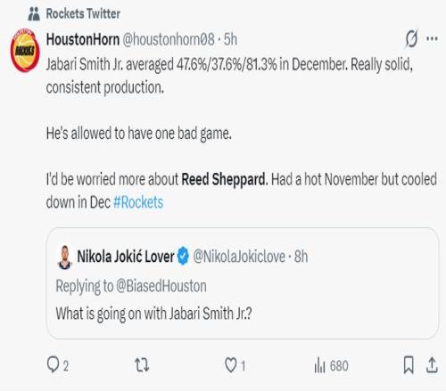 休媒:我们允许小贾巴里-史密斯拉胯一战比赛,因为他12月份命中率47.6%,三分命中率37.6%,但谢泼德经历了11月的火热后12月就开始状态大跌,糟糕的状态还延续到了一月份。
