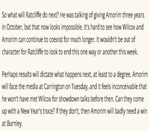 拉爵去年10月还说要给阿莫林三年时间重建,然而,《曼彻斯特晚报》断言这已不可能,阿莫林和威尔考克斯如果继续合作,恐怕也会心存芥蒂。以拉爵的性格,他可能本周就做出改变。