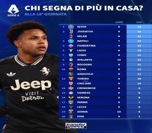 北京时间1月5日,在意甲前18轮结束后,德转列出了本赛季意甲球队主场进球数排行榜,国际米兰以9场打进24球断档领先,尤文图斯和AC米兰同以15球并列第二位。