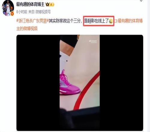 加时赛最争议的两个吹判是,陈家政的三分究竟是不是踩线了,虽然裁判看了回放,判陈家政踩线了,但是不是第一回合结束后看回放,而是打了第二个回合才看回放,这是非常荒唐的事,陈家政打平和反超一分后的广东队进攻方法是不相同的,这完全影响了广东队的进攻策略。有媒体人晒出视频,证明陈家政并未踩线,是一个三分球。媒体人“最有趣的体育博主”指出:其实陈家政这个三分,是鞋影在线上了。也就是说陈家政的鞋并未踩线,而是鞋影在线上的,裁判误把鞋影当成了踩线,你说这冤不冤?