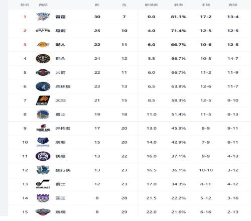 西部排名又变了:雷霆爆冷连败,快船高歌猛进,2队排名互换
