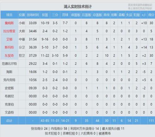 此役过后,湖人重返西部第三,胜场数和第四的掘金一样,领先第五的火箭0.5个胜场!最后看看数据,说说你的感受:
