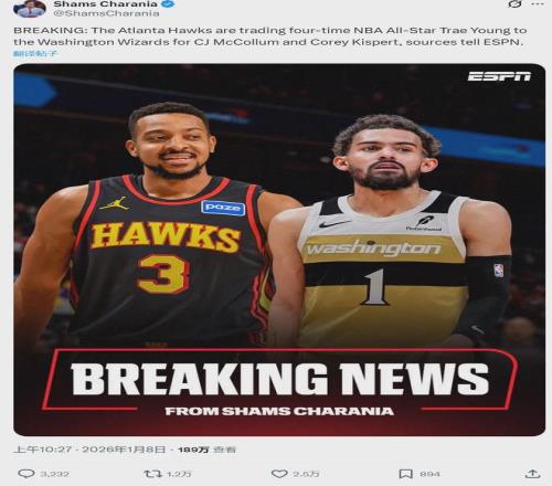 北京时间1月8日上午10点半,NBA名记Shams Charania最新报道,亚特兰大老鹰队将四届NBA全明星球员特雷-杨交易至华盛顿奇才队,换来CJ-麦科勒姆和科里-基斯珀特。这是一笔2换1的交易,双方都没有提供选秀权补偿对方。