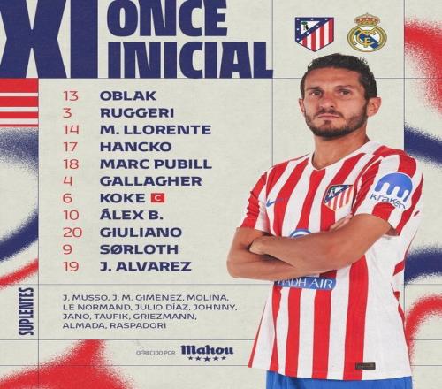 马竞首发:13-奥布拉克、3-鲁杰里、17-汉茨科、18-普维尔、14- 马科斯-略伦特、4-加拉格尔、6-科克、10-巴埃纳、20-小西蒙尼、9-瑟洛特、19-阿尔瓦雷斯