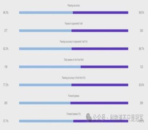 本场利物浦的总传球次数(509vs459)、传球准确率(89%vs86.3%)、前场传球次数(300vs277)、前场传球准确率(88.7%vs82.3%)全面占优!这可是在阿森纳的主场。