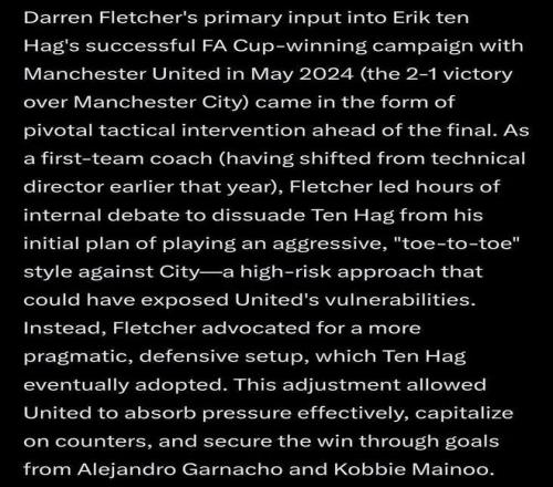 「竞技网」的报道甚至回顾到滕哈格带队夺取足总杯决赛的时候,称当时的防守反击战术出自弗莱彻的提议。