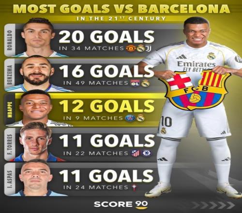 北京时间1月12日凌晨,皇马将在西超杯决赛中对阵巴萨。Score90统计了本世纪球员对阵巴萨的进球数量,C罗、本泽马、姆巴佩排名前三。本世纪对阵巴萨进球榜: