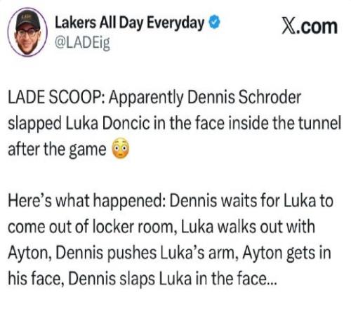 据球迷爆料,当时施罗德在更衣室外守株待奇,东契奇与顿宝一同走出时,施罗德推搡东契奇手臂,顿宝上前对峙,施罗德随即扇中东契奇面部。